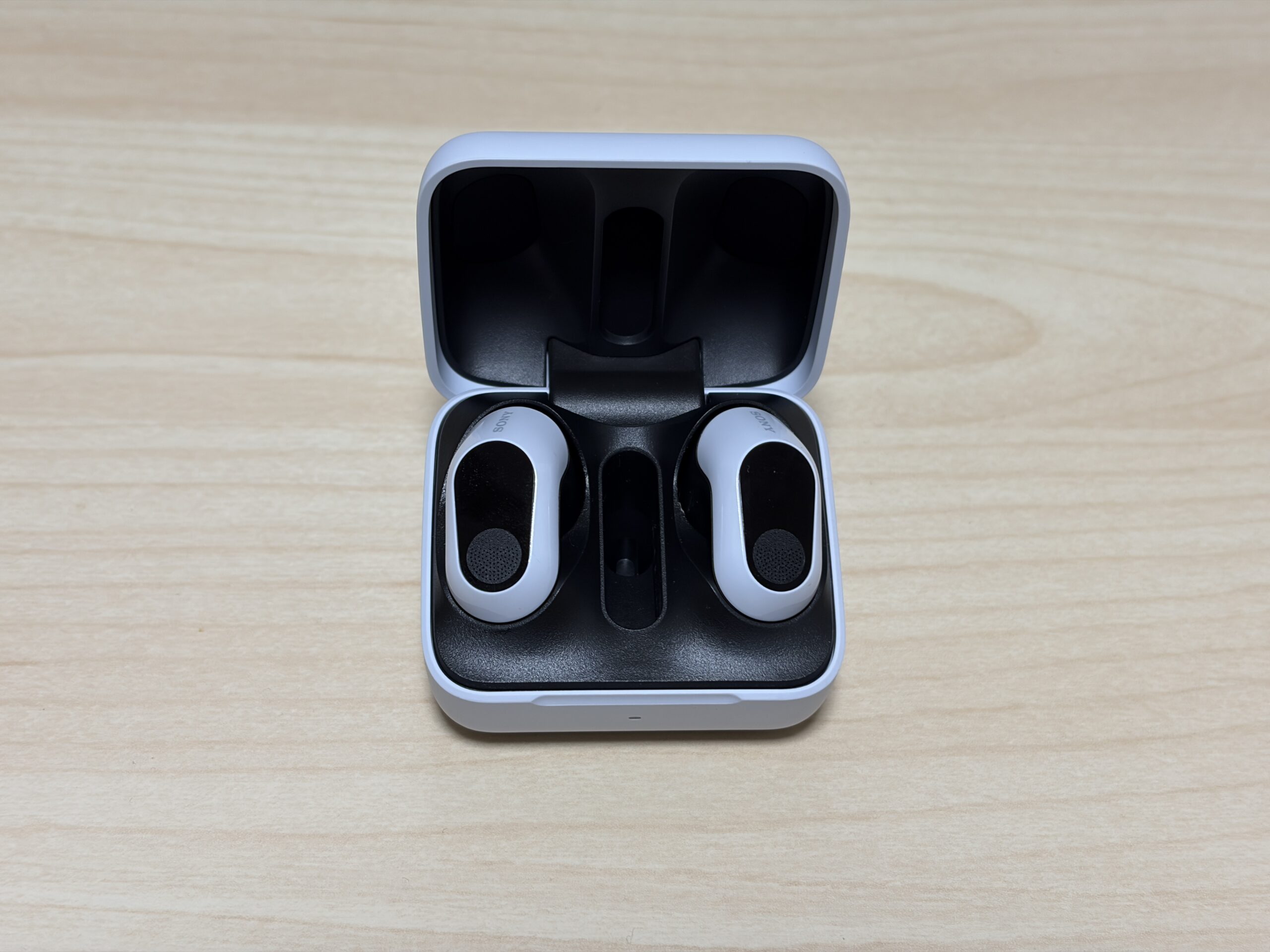 白くてデカい。ワイヤレスイヤホンではでかい部類に入ると思う。人によっては耳に違和感あるかも。